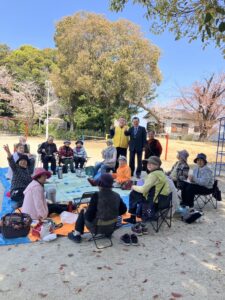 弥生クラブの高齢者と、岡本公園で花見をしました! 世代間交流です。古き良き時代の再生も心がけます。